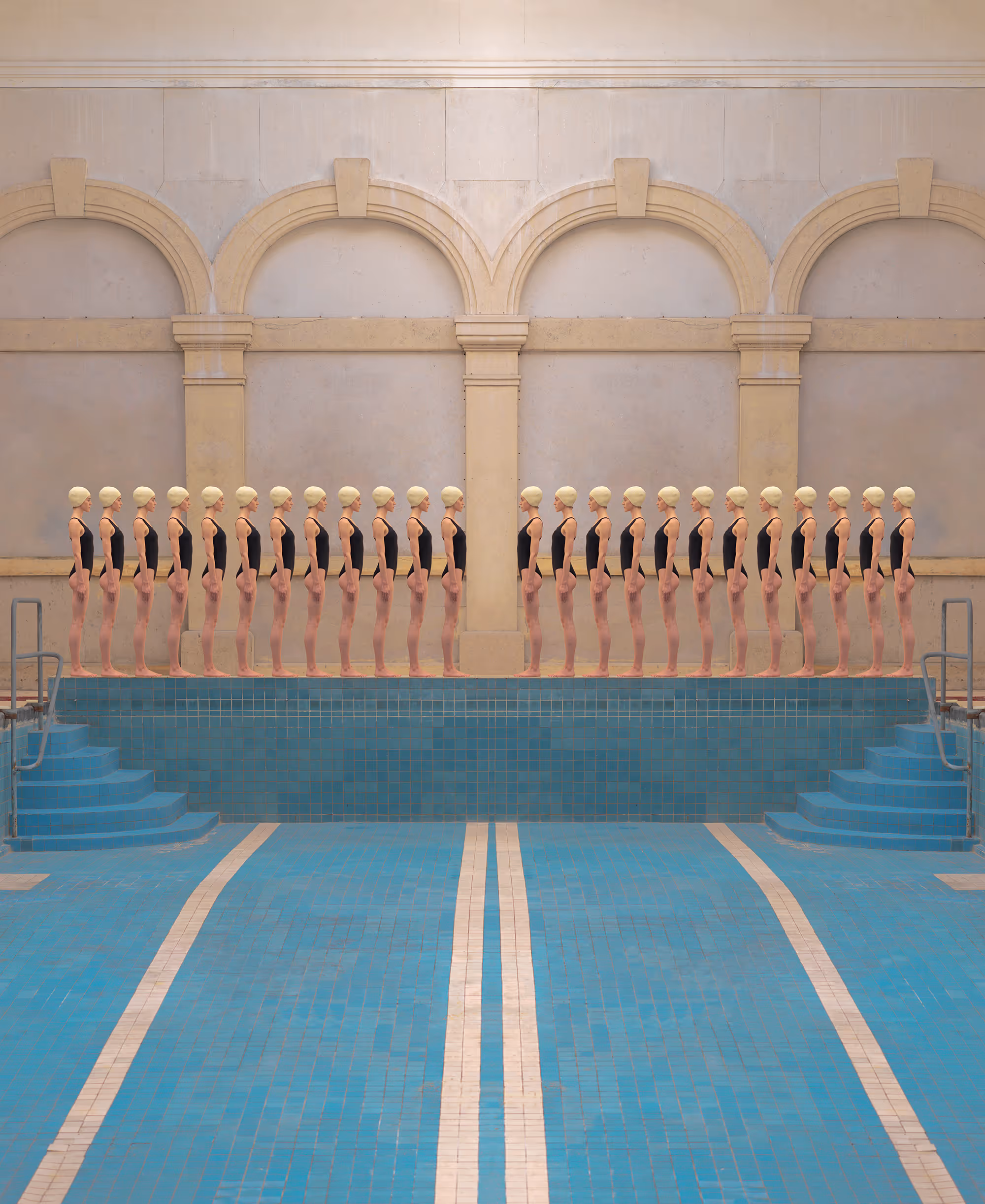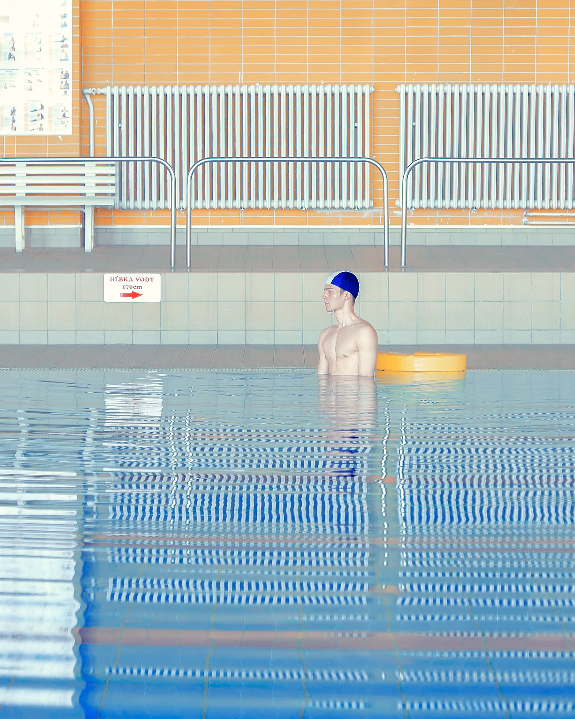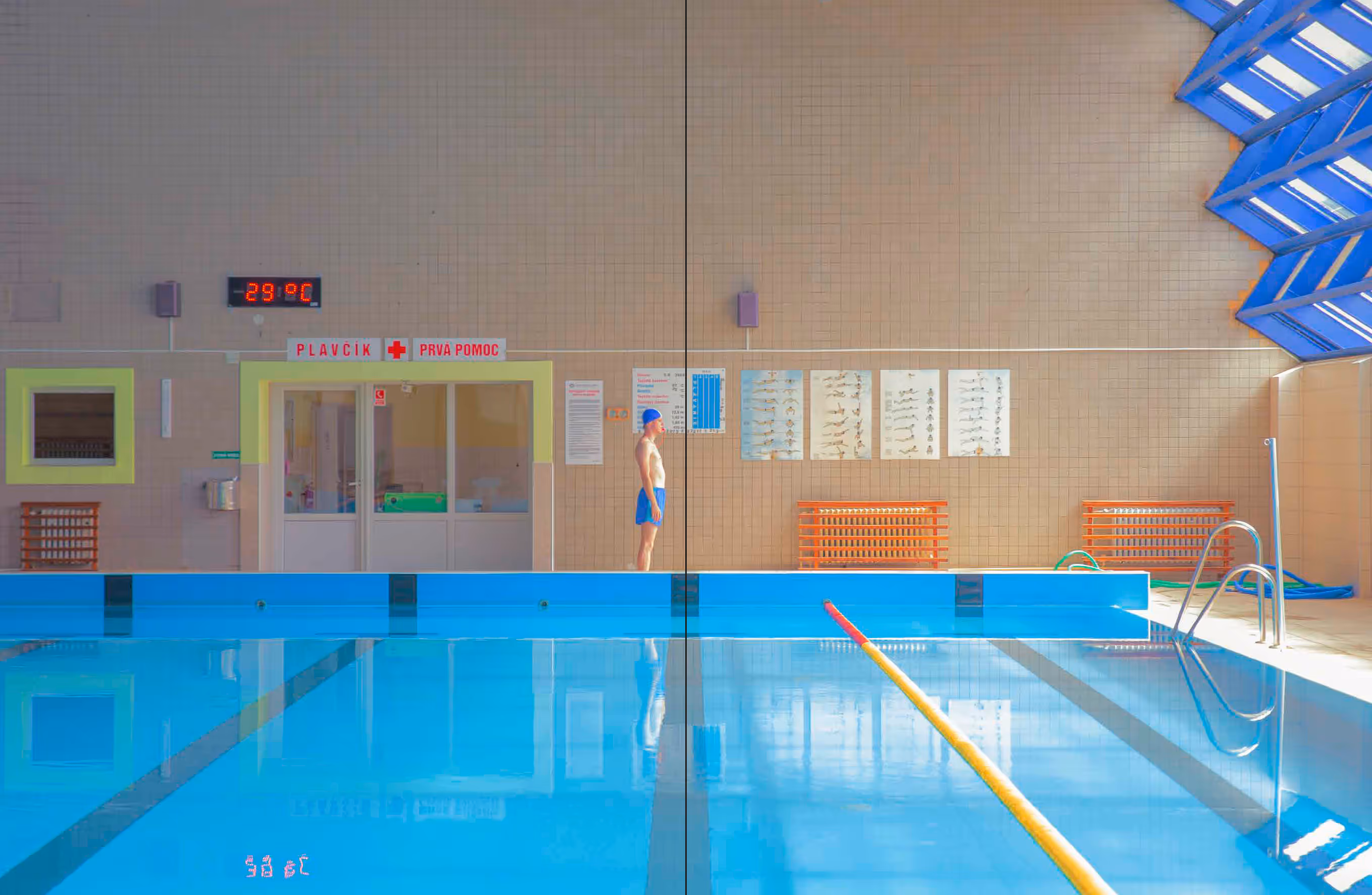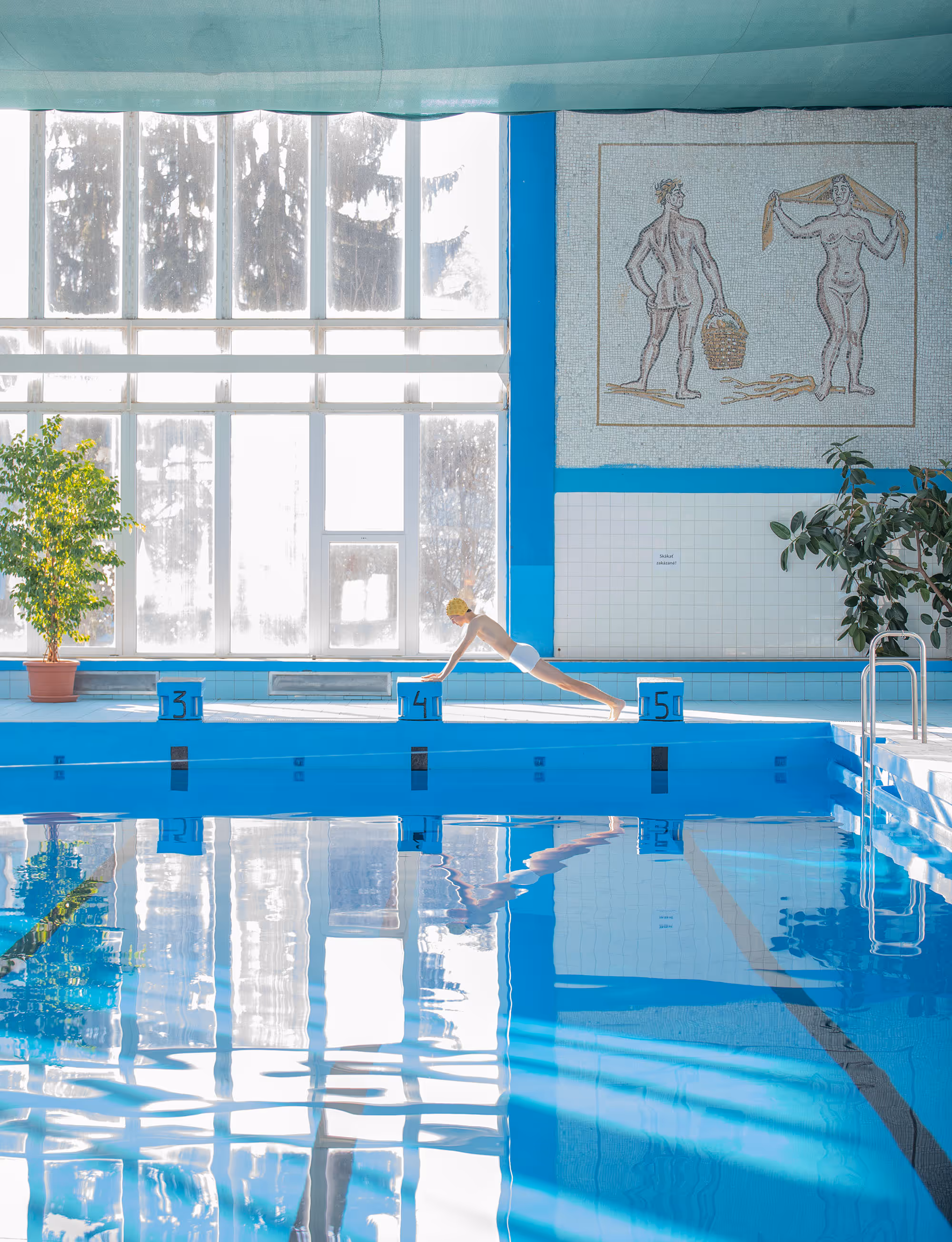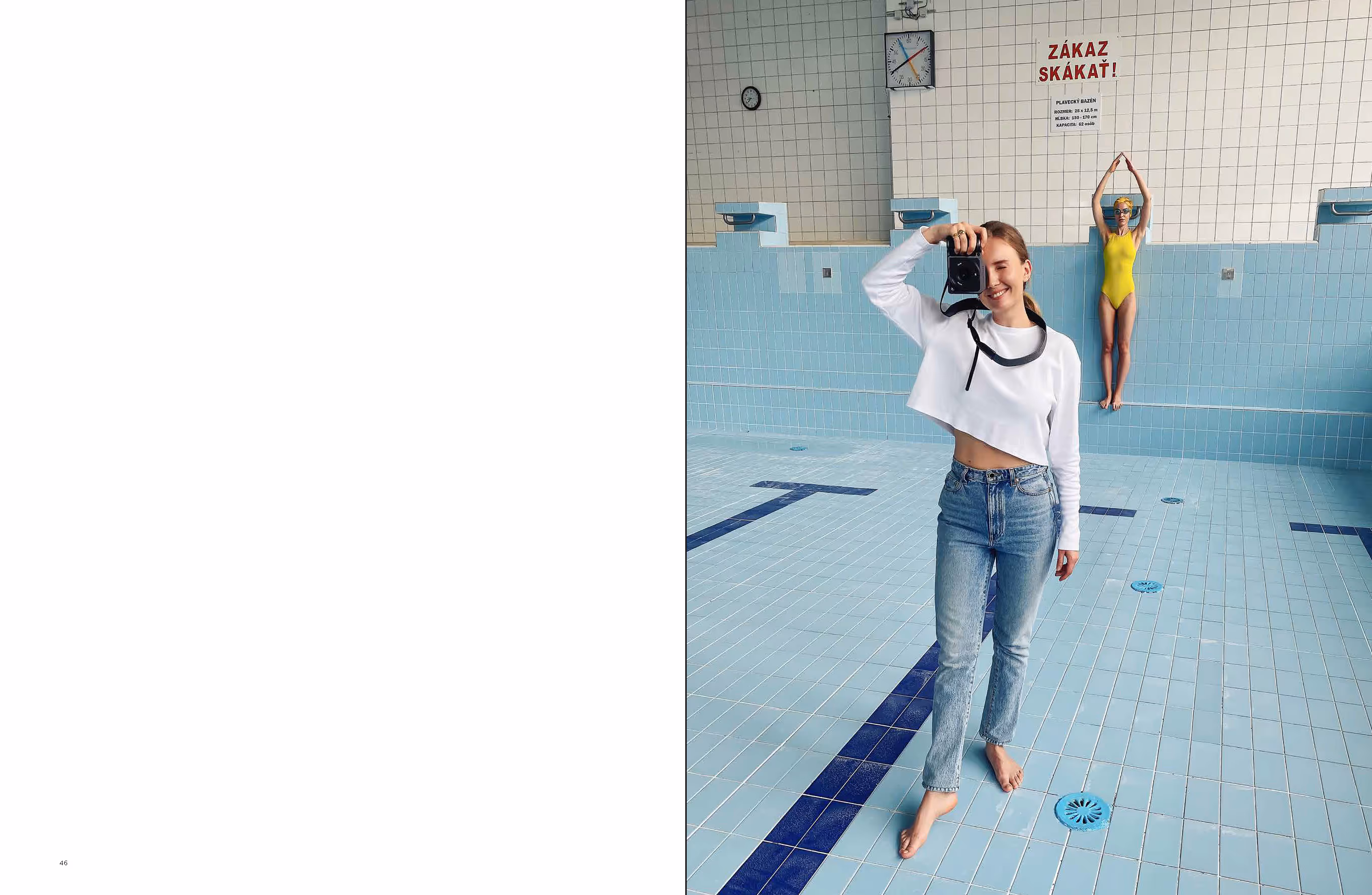 Photographer Mária Švarbová has an enduring fascination with the functionalist architecture of Soviet-era buildings, largely inspired by a 2014 visit to a closed swimming pool in Švarbová’s native Slovakia. Discovering themes of female empowerment and a more intimate view of the relationship between models, we see her subjects frozen in the composition, the swimmers as smooth and cold as the pool tiles, with colors softly vibrating in a dream-like atmosphere.
